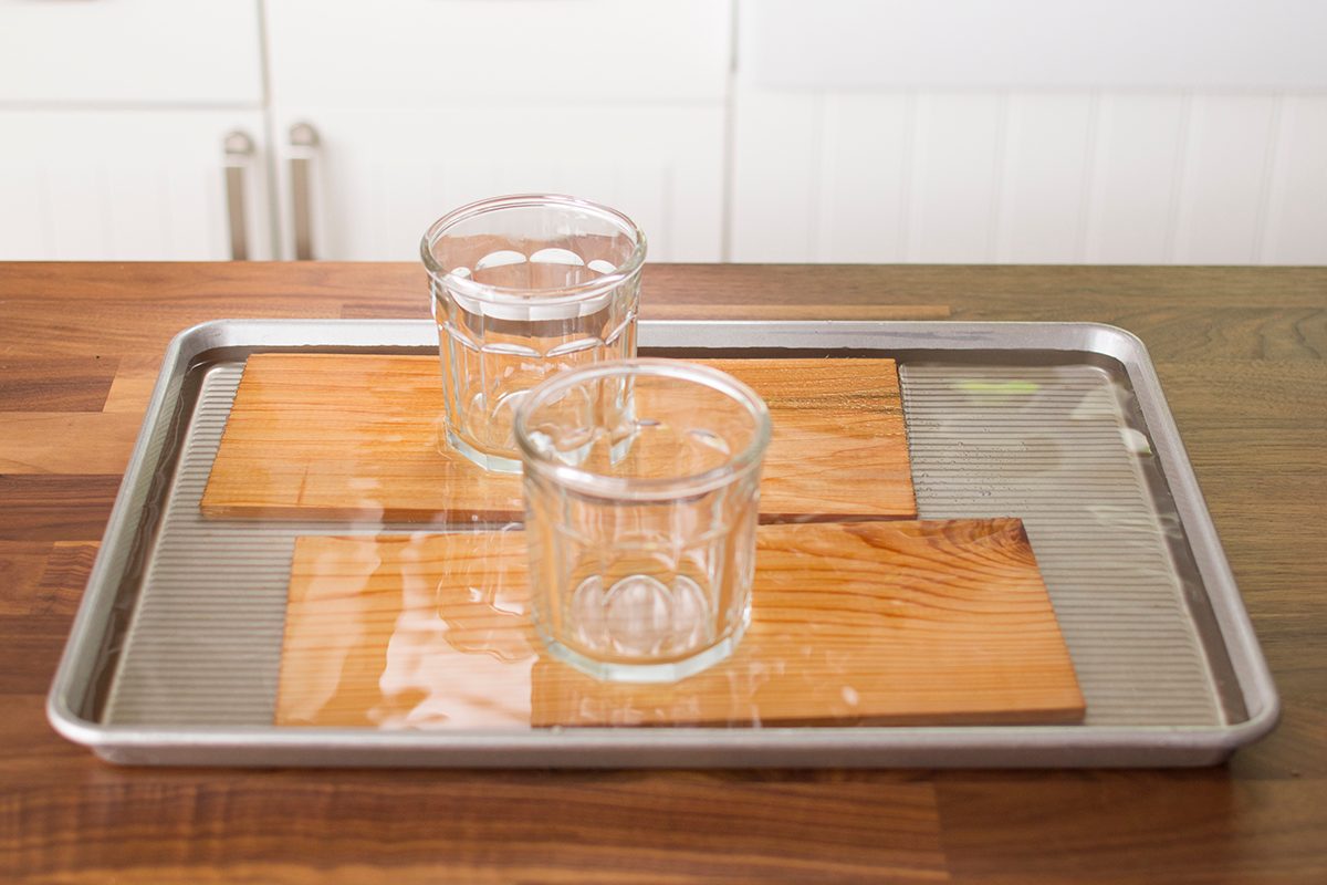 Now it’s tub time for your planks. Soak the boards in water for at least one hour (though three or four is better). The best way to soak your planks is to submerge the wood in a baking dish or rimmed sheet pan. Use a heavy can to keep them from floating. Flip occasionally to make sure they’re evenly soaked.