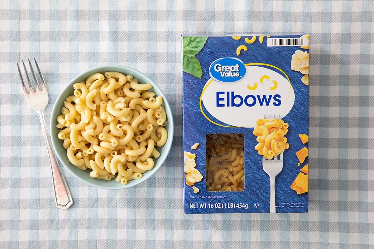 Making big pans of macaroni and cheese? Splurge on the cheese and save on the pasta. You can get a 16-ounce box of Great Value elbows for 80 cents! A two-pound box comes in at about $1.30. And for that great price, you get a larger macaroni noodle with a nice pale yellow hue and textbook macaroni flavor.