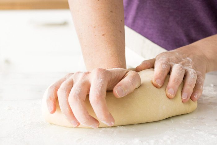 Editor’s Tip: Be sure to flour your hands as well. Knead the dough by pushing it forward with the heel of your hand and then folding it over itself. As you knead the dough on a lightly floured surface, the dough will pick up a little more flour and should eventually feel smooth and satiny. If the dough is not sticking to your hands or the kneading surface, don’t add any more flour.