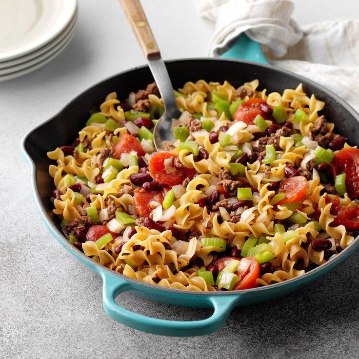 Right after I got married, an aunt gave me her recipe for skillet spaghetti and told me it was ideal for a quick weeknight meal. Over the years I’ve tinkered with the ingredients and played with the seasonings to make it a healthier dish that my family truly loves. —Kristen Killian, Depew, New York