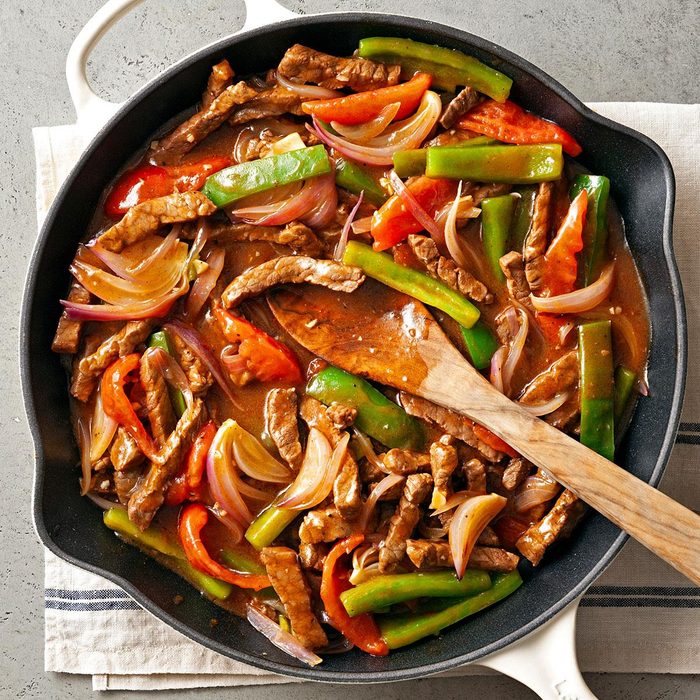 We live on the eastern edge of the Sand Hills here in Nebraska, where most folks are ranchers. This popular pepper steak recipe is tasty as well as colorful. —Carolyn Butterfield, Atkinson, Nebraska