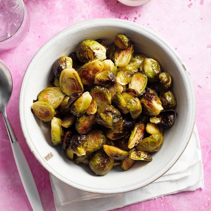 I like to toss oven-roasted Brussels sprouts with a mixture of maple syrup and mayo for a delicious side dish. They taste so good that even kids ask for seconds! —DonnaMarie Ryan, Topsfield, Massachusetts