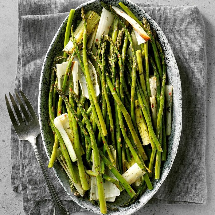 No vegetable says spring quite like asparagus. In this recipe, we combine pretty green spears with leeks. Crushed red pepper adds a bit of zest.—Taste of Home Test Kitchen