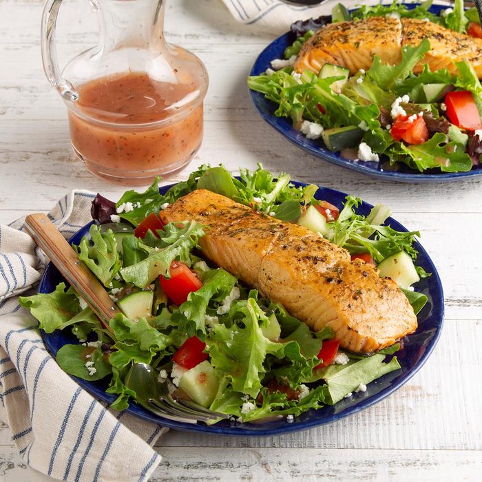 Need a healthy, quick dinner? This salad comes together in about 20 minutes. Broiled salmon cooks in about the time it takes to mix a vinaigrette. Add just about any veggies, nuts, seeds or dried fruits you like.