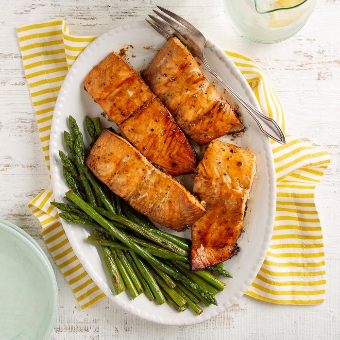 Here’s a prime example of salmon’s ability to transform with strong flavors. A rich glaze of soy sauce, red wine vinegar and lemon soaks into the fish while fresh Parmesan crusts the outside.