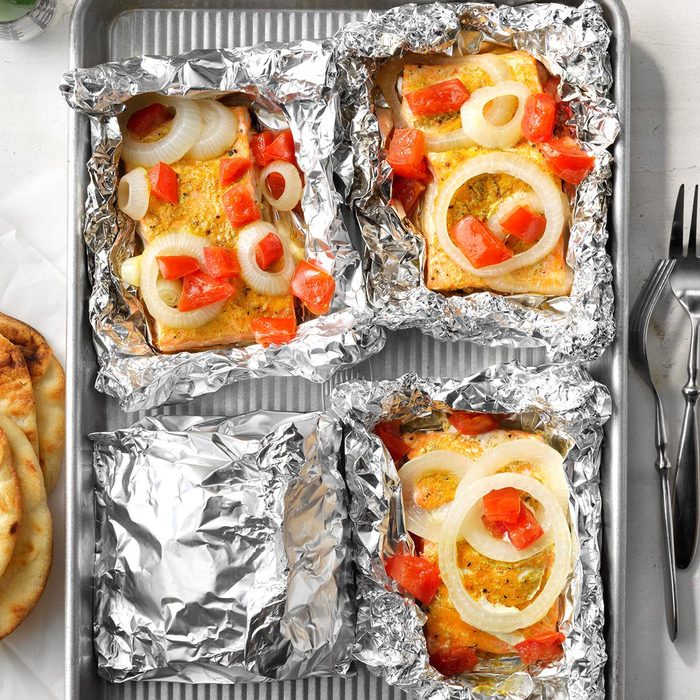 Steamed in its own juices, this grilled salmon in foil is incredibly tender. Curry adds a punch of flavor that’s perfectly balanced by onion and tomato. —Merideth Berkovich, The Dalles, Oregon