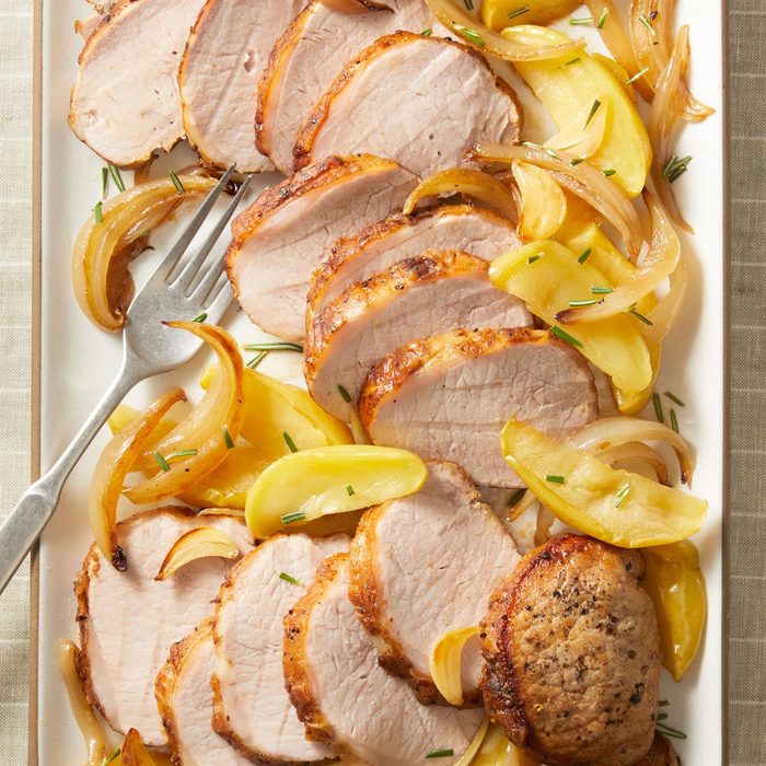 The sweetness of the apples and onions nicely complements the roast pork. With its crisp, golden exterior and melt-in-your-mouth flavor, this pork is my family's favorite weekend dinner. —Lily Julow, Lawrenceville, Georgia
