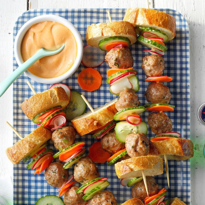 I love banh mi sandwiches but wanted to make them a little easier to serve for a party. These skewers are a really fun twist! For easier prep on the day of the party, make the meatballs in advance and freeze them. —Elisabeth Larsen, Pleasant Grove, Utah