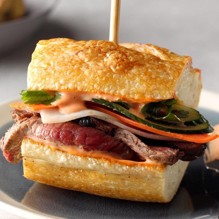 This recipe is a Cambodian version of the classic Vietnamese dish banh mi. This sandwich has acidity from the pickled vegetables, freshness from the cucumber, spiciness from the Sriracha mayo and sweetness from the marinated beef. —Hudson Stiver, Bowen Island, British Columbia