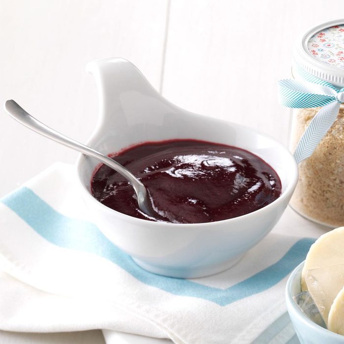 On weekends, I jazz up our favorite BBQ sauce with berries. This blackberry-blueberry BBQ sauce makes a marvelous spread for basting and saucing grilled baby back ribs. —Janet Hix, Austin, Texas