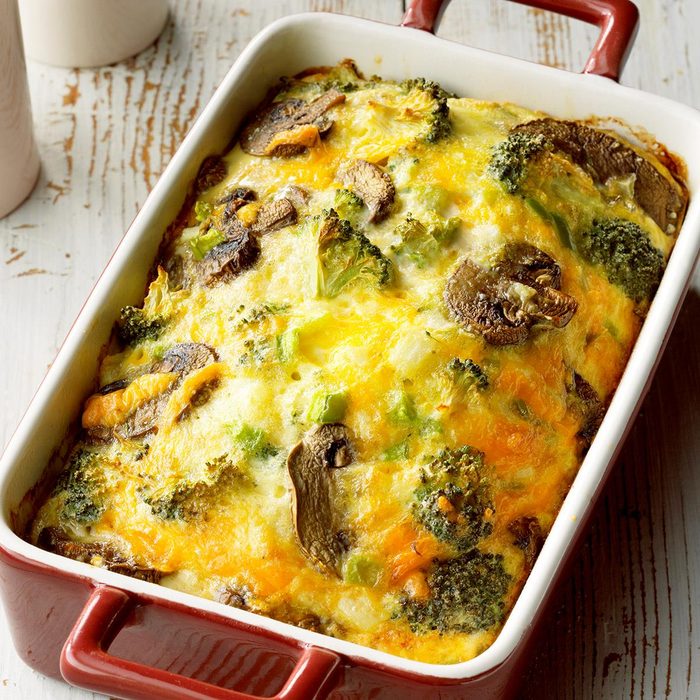 From the Recipe Creator: Rich with veggies and melted cheese, this comforting and colorful egg bake has become a holiday brunch classic in our home. For a tasty variation, try substituting asparagus for the broccoli and Swiss for the cheddar cheese. —Irene Steinmeyer, Denver, Colorado