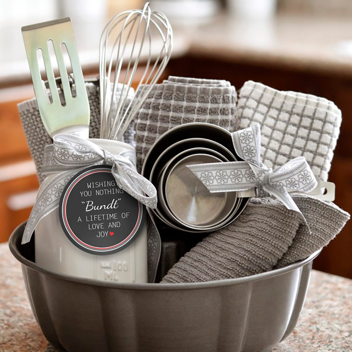 If you’ve ever received a gift basket, you know that the basket itself oftentimes goes to waste. A bundt pan, on the other hand, is a cute yet functional holder for all of your goodies. Gather inspiration from Darling Doodles and gift one of these adorable bundt baskets to a newlywed couple, a new neighbor or any other deserving recipient.