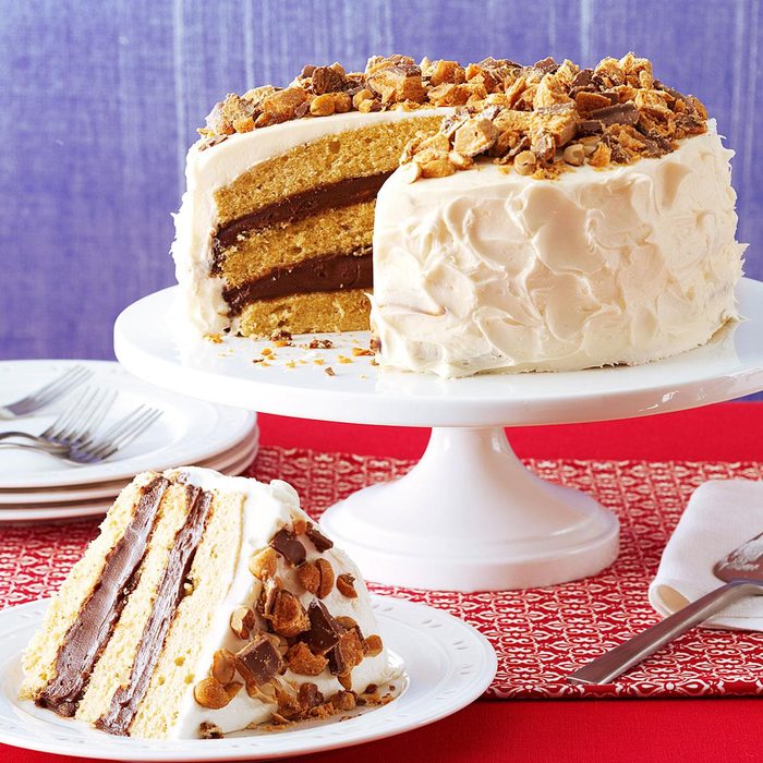 No one will guess that this tall, tiered cake isn't completely homemade. Chunky peanut butter is stirred into both the cake batter and the decadent chocolate ganache, giving each layer a rich, from-scratch taste. —Taste of Home Test Kitchen
