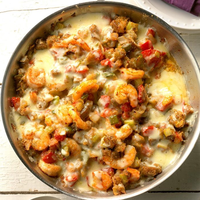 We always have a large summer garden where lots of produce lingers into fall. That’s when we harvest our onions, bell peppers, tomatoes and eggplant—some key ingredients of this dish. This recipe turns Cajun with the holy trinity (onion, celery and bell pepper), shrimp and red pepper flakes. —Barbara Hahn, Park Hills, Missouri