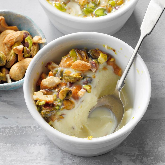 I grew up near Little India in California, and I loved the desserts from Indian sweets shops. One of them sold kulfi, a spiced and nutty frozen custard in cone molds. Here I use a shortcut method to make kulfi quickly and without any special equipment. The whole milk can be replaced with mango pulp for mango kulfi. —Justine Kmiecik, Crestview, Florida