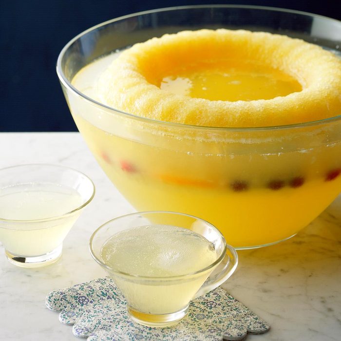 One of the best things about punch bowl cocktails is they can be made ahead of time, and then jazzed up with fresh bubbles before guests arrive. To make this one, you’ll need any ring mold you use for Jell-O recipes. Line the mold with orange slices and frozen cranberries, pour pineapple juice and ginger ale on top, then freeze until you’re ready to pop it in the bowl. It’s an instant party pleaser!