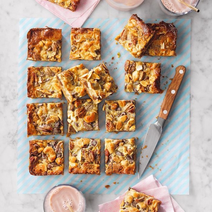 These vegan magic bars are one of the easiest treats you can make. By using plant-based butter and condensed coconut milk, they are completely vegan-friendly. I also added some dried pineapple, mango and macadamia nuts to give them the tropical spin. —James Schend, Taste of Home Deputy Editor