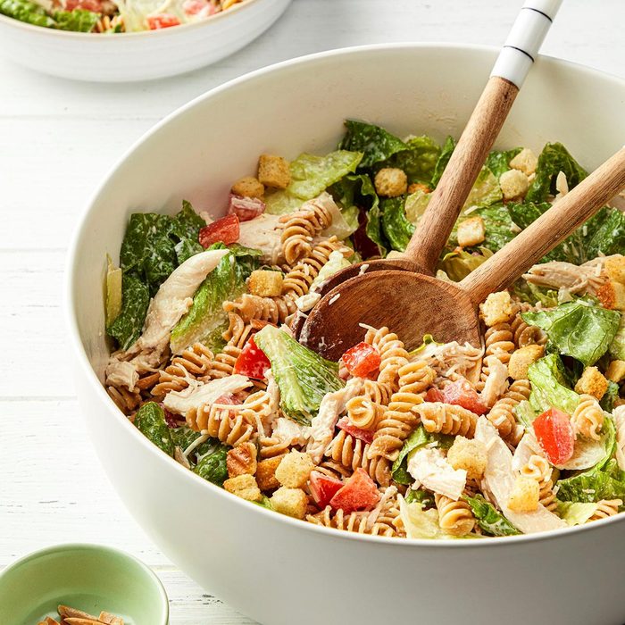Pre-cooked rotisserie chicken helps this filling pasta salad come together in a flash. For an extra impressive dish, make creamy Caesar dressing from scratch.