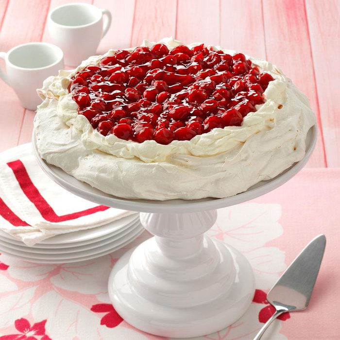 Our Amish friend Naomi Yoder makes this meringue heart topped with cream cheese and pie filling whenever we visit. Her family’s farm is a stop on our wagon train vacation. —Judy Herbkersman, Collins, Ohio