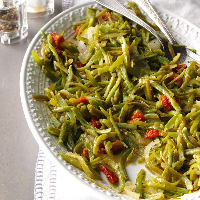 These green beans travel so well because they can either be served at room temperature or reheated at the party. —Christine Bergman, Suwanee, Georgia
