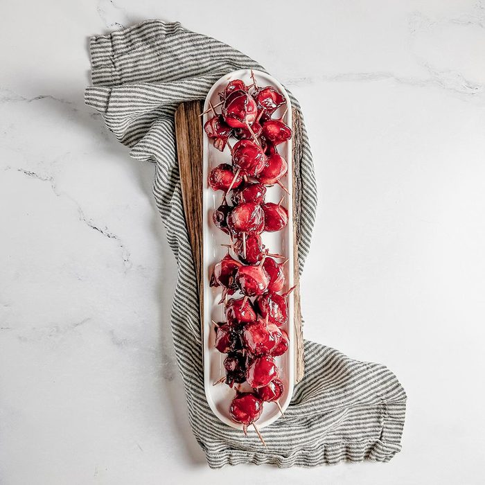 This crowd-favorite appetizer can be assembled in minutes, leaving more time for the main meal. A quick marinade turns mozzarella into a festive holiday party treat.