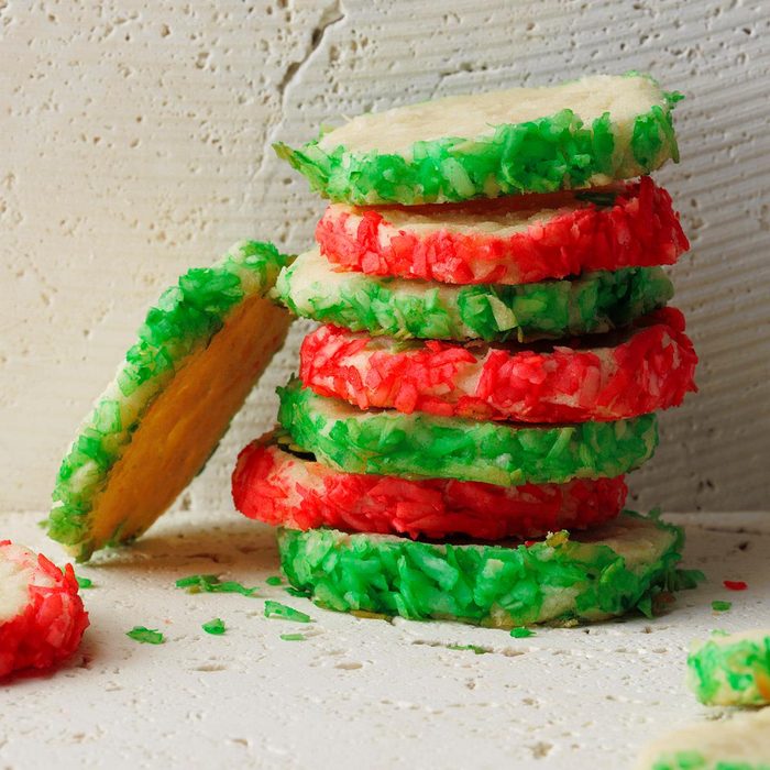 Tinting flaky white coconut reminds me of snowflakes falling under holiday lights. The reds and greens add colorful Christmas wonder. — Lee Roberts, Racine, Wisconsin