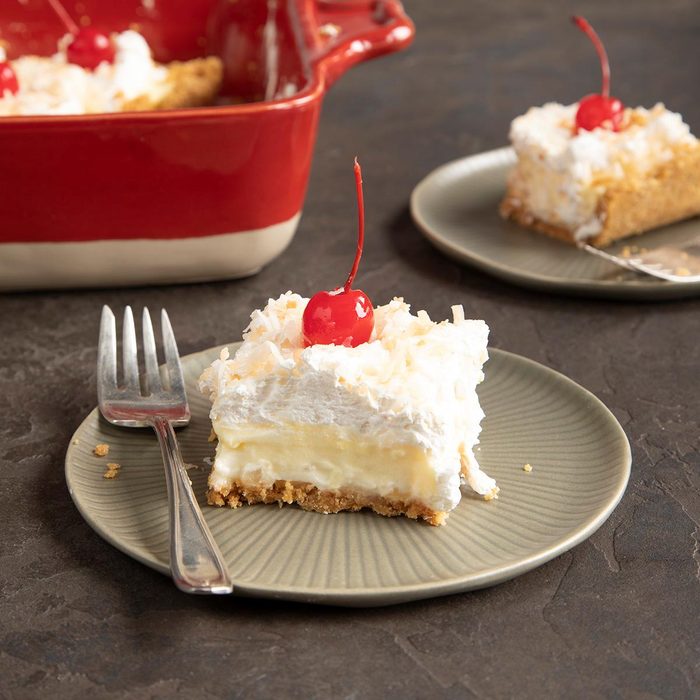 Transform a pina colada, almost everyone’s favorite tropical cocktail, into a summer dessert for all to enjoy. This recipe starts with a crumb crust, and then layers of creamy whipped topping, pudding and coconut get piled on top.