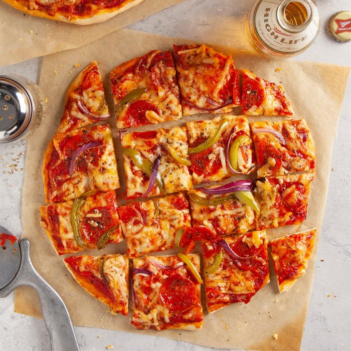 In the city that never sleeps, by-the-slice pizza is sold from storefront windows. While it may not be quite as quick and easy, this homemade New York-style pizza is just like the real thing—floppy, foldable crust and all.
