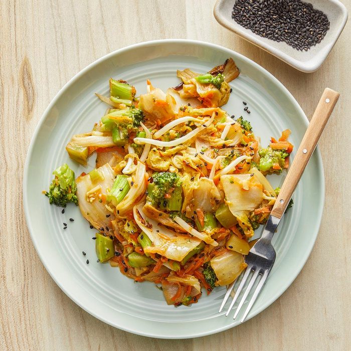 This stir-fry's sweet and salty sauce is made predominately with miso, maple and butter. While you can use other veggies for this recipe, cabbage and broccoli are fresh and crisp, taking well to the sauce’s umami flavor. Serve the veggies over rice or rice noodles. —Pamela Gelsomini, Wrentham, Massachusetts