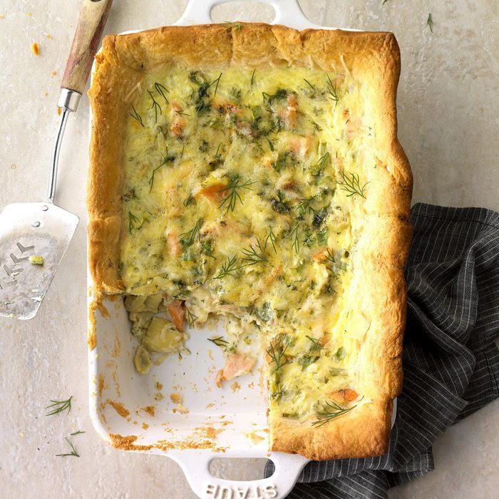 Salmon, goat cheese and artichoke hearts make this quiche feel a little fancy and taste extra delicious. Baked in an 11×7-inch dish, it comes together in a snap and makes enough to serve a hungry brunch crowd. —Jeanne Holt, Mendota Heights, Minnesota