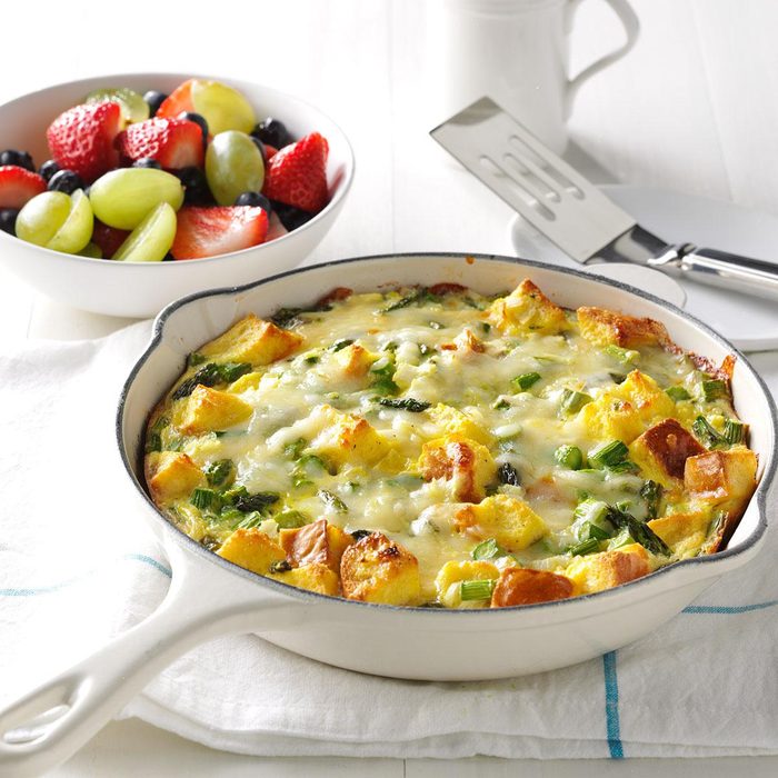 We start this strata recipe the night before so it's ready for the oven the next day. That way, we don't have to deal with the prep and dirty dishes first thing in the morning! —Debbie Johnson, Centertown, Missouri