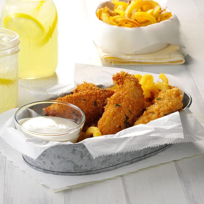 I recently made this recipe of Mom's for my in-laws and they told me it was the "best fried chicken ever." Slicing the chicken breasts into strips cuts down on cooking time and ensures every piece is crunchy and evenly coated. Serve the homemade chicken tenders with your favorite dipping sauce. —Genny Monchamp, Redding, California