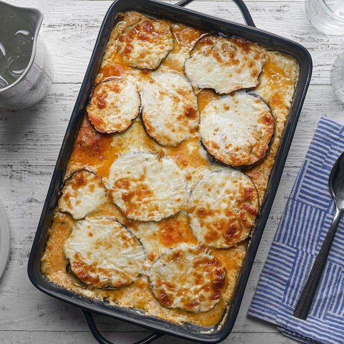 Traditional moussaka often uses lamb as the meat filling, but this twist uses ground beef. Like the Greek version of lasagna, layers of eggplant, potato and tomato make it hearty and delicious.