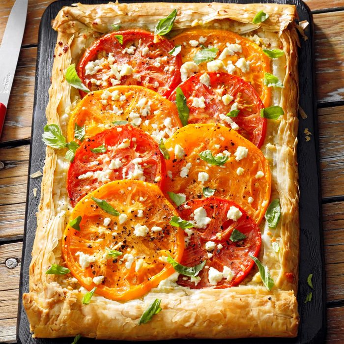 Signature Mediterranean ingredients—including basil, tomatoes, feta and phyllo—meld beautifully in this fresh and airy flatbread-like dish. —Diane Halferty, Corpus Christi, Texas