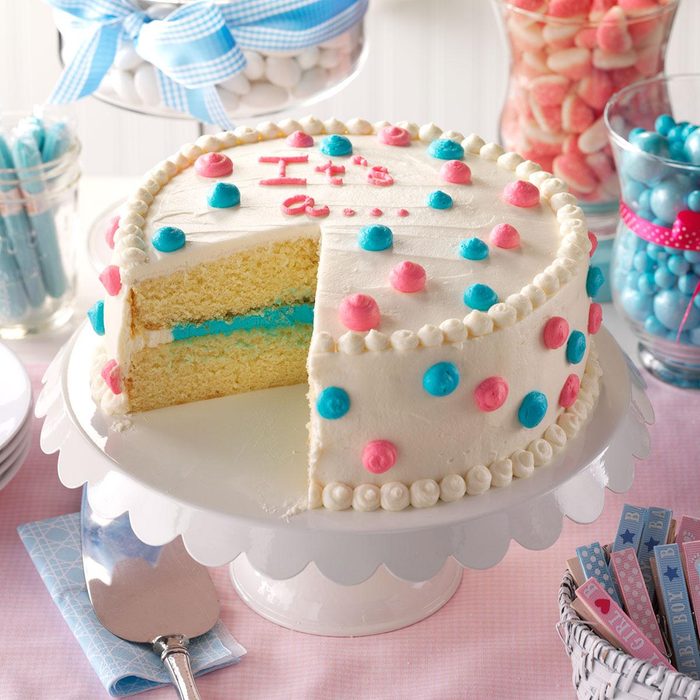 For a dramatic gender reveal, turn your favorite layer cake recipe into an edible piñata. To make, you’ll need 4-5 cake layers. Keep the bottom and top layers intact, then remove the centers of the remaining layers. Stack the cake, putting icing between each layer, then fill the center with pink or blue candies and sprinkles. Add the top layer and decorate as desired.