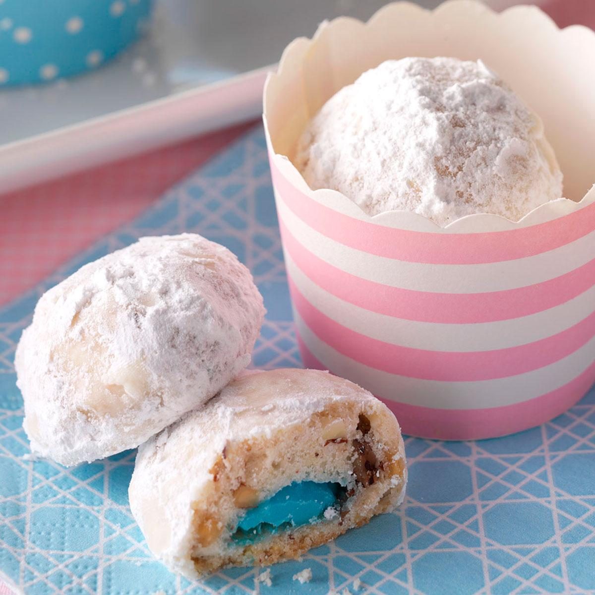 For a dramatic gender reveal, turn your favorite layer cake recipe into an edible piñata. To make, you’ll need 4-5 cake layers. Keep the bottom and top layers intact, then remove the centers of the remaining layers. Stack the cake, putting icing between each layer, then fill the center with pink or blue candies and sprinkles. Add the top layer and decorate as desired.