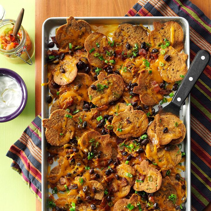 You won’t find these chips at the store. They’re made from pita bread cut with a cookie cutter and baked until very crispy. These nachos are topped with bacon, black beans and cheddar cheese.