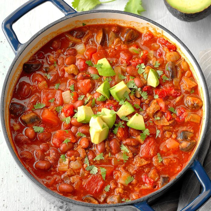 Rich and flavorful, this chili is absolutely packed with fun veggies like mushrooms, beans and sun-dried tomatoes. It's so filling, you'll win over any meat lover. —Pam Ivbuls, Omaha, Nebraska