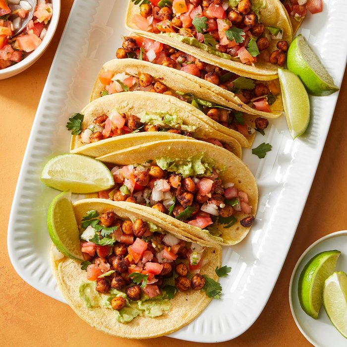 Alternate your vegetarian taco nights with a chickpea version. The legumes are coated in a spicy seasoning blend and then baked for a crunchy, flavorful bite that’s easy to build onto. —Margaret Knoebel, Milwaukee, Wisconsin