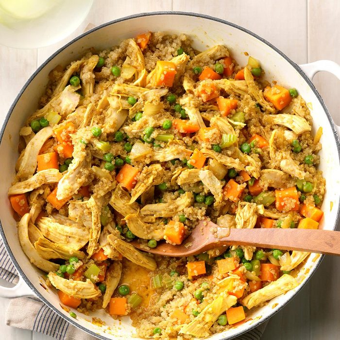 This protein-packed skillet dish is loaded with bright flavor. A little curry and fresh ginger make the veggies, chicken and quinoa pop. —Ruth Hartunian-Alumbaugh, Willimantic, Connecticut