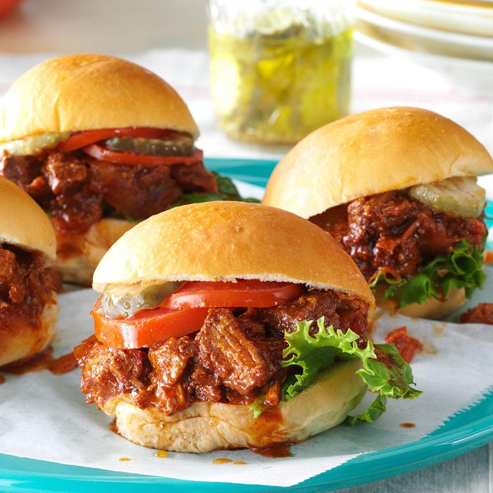 A boneless beef roast simmers for hours in a slightly sweet sauce before it's shredded and tucked into rolls to make hearty sandwiches. This is a family favorite. —Jennifer Bauer, Lansing, Michigan