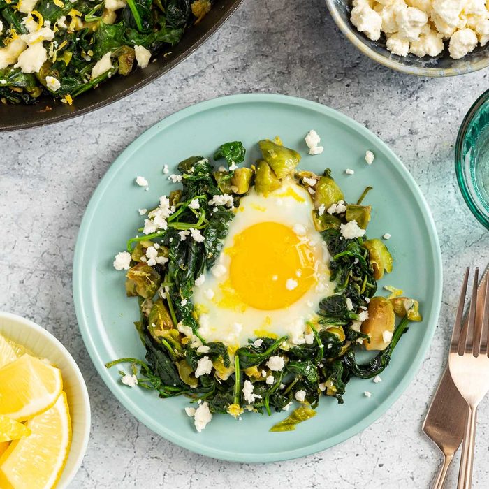 Traditionally, shakshuka is a skillet of spiced tomato sauce and poached eggs, but this version trades tomatoes for a mixture of wilted greens, Brussels sprouts and parsley. Cover the skillet tightly after adding the eggs so the steam fully cooks the egg whites.