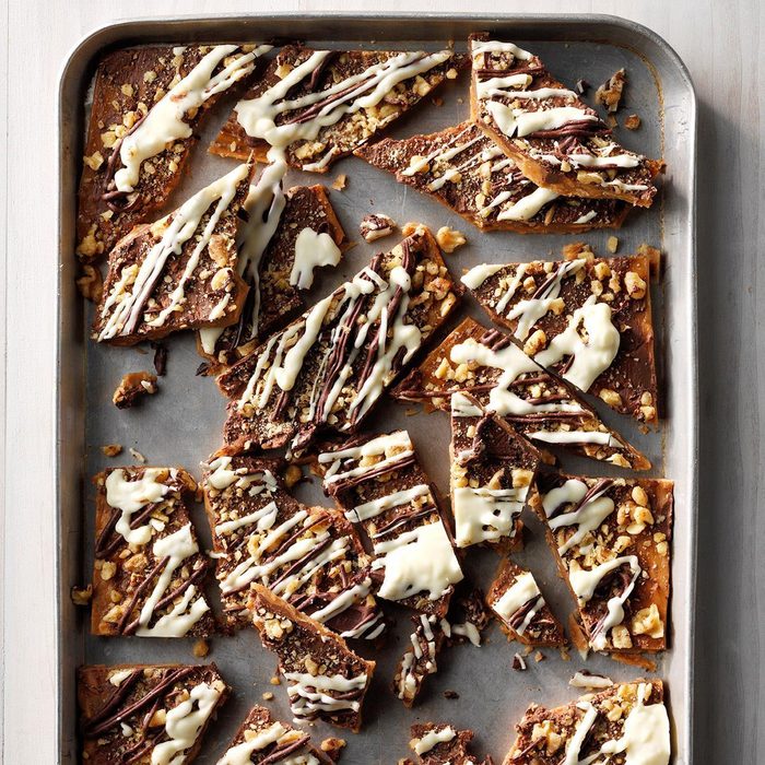 With its melt-in-your-mouth texture and scrumptiously rich flavor, this is the ultimate toffee! Layered on top are three kinds of melted chips plus a sprinkling of walnuts. Packaged in colorful tins, these pretty pieces make impressive gifts. —Lana Petfield, Richmond, Virginia