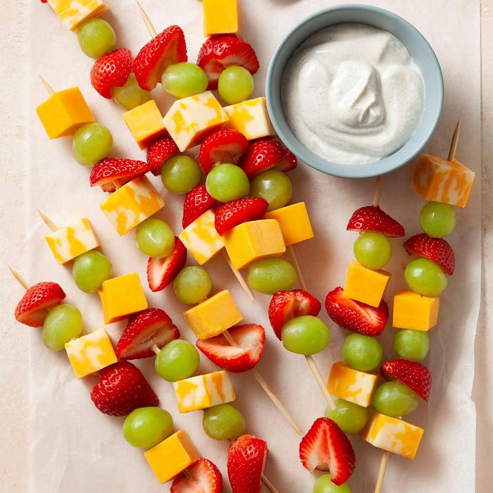 Fruit skewers made with fresh fruit, cheese and a cinnamon yogurt dip will become a regular snack for every potluck, barbecue and game-day party.