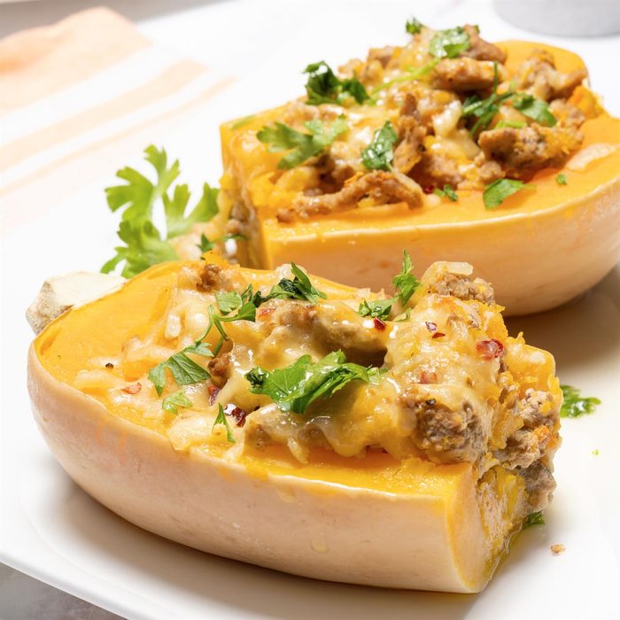 Load butternut squash shells with an Italian turkey sausage and squash mixture for a quick and easy meal. Even better, it's surprisingly low in calories. —Katia Slinger, Columbus, Georgia