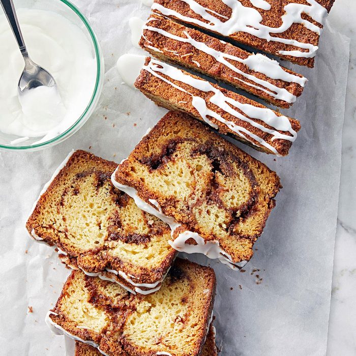 Our contest-winning cinnamon quick bread is like the easier version of coffee cake or cinnamon rolls, complete with the vanilla icing drizzle and cinnamon swirl. Bake this the day before and store it in an airtight container to lock in the moisture.
