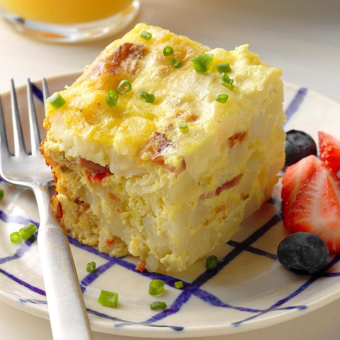 Hash browns, eggs, bacon, onions and cheese join forces for a 12-serving dish that can be made up to four days in advance. You can even freeze it!