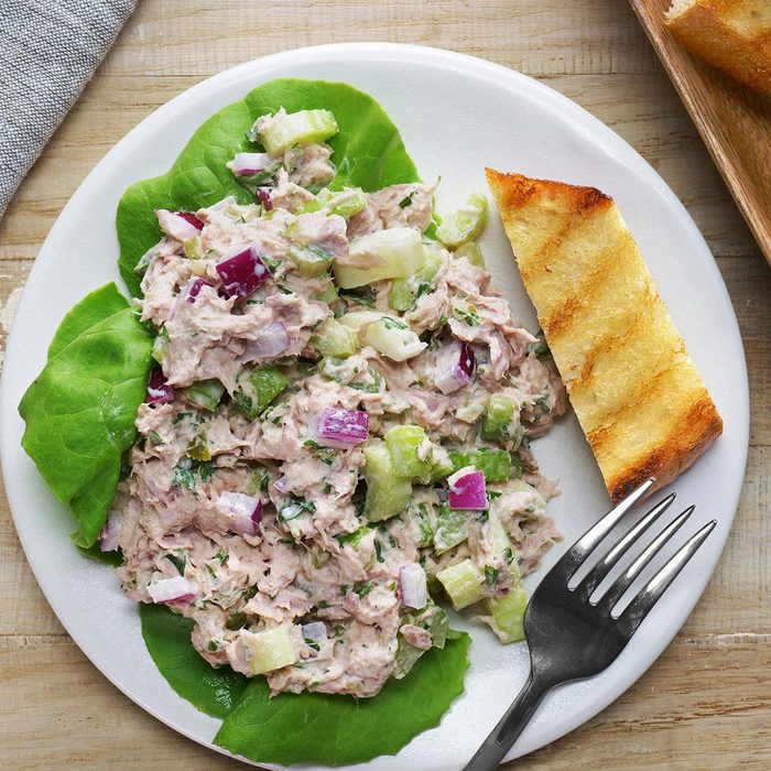 To prevent any side-eyes from your co-workers, go with a good-quality albacore canned tuna. It has a less fishy aroma than skipjack tuna, which is the usual type of tuna in “chunk light” cans.