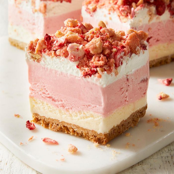 While growing up, I loved treats from the ice cream truck that rolled through my neighborhood. This ice cream cake is inspired by one of those crunchy, strawberry novelties. —Lisa Kaminski, Wauwatosa, Wisconsin