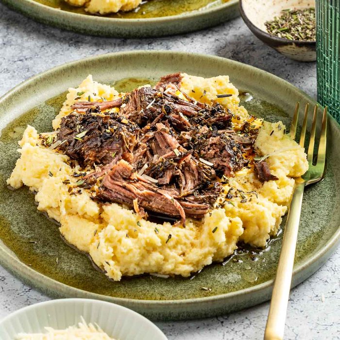 A slow cooker is the secret to meltingly tender shredded beef for a meal that’s elevated comfort food. The Parmesan polenta served with the meat is cooked in half milk and half water. You could use all water or broth for a lighter polenta or all milk for an extra-creamy version.